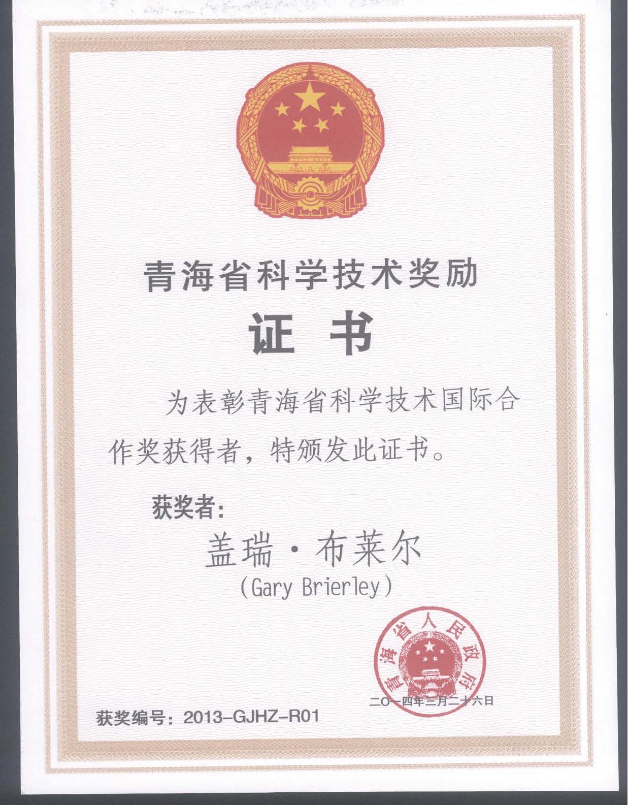 团队外方成员新西兰奥克兰大学Gary Brierley教授获得2013年度青海省科学技术国际合作奖,同时被国家外专局批准为2014-2016年度高端外国专家。团队负责人李希来教授获得2014年度中国侨界贡献奖(创新人才)。团队成员严林、胡夏嵩和孙海群分别获得2013年至2015年度青海省科技进步三等奖。