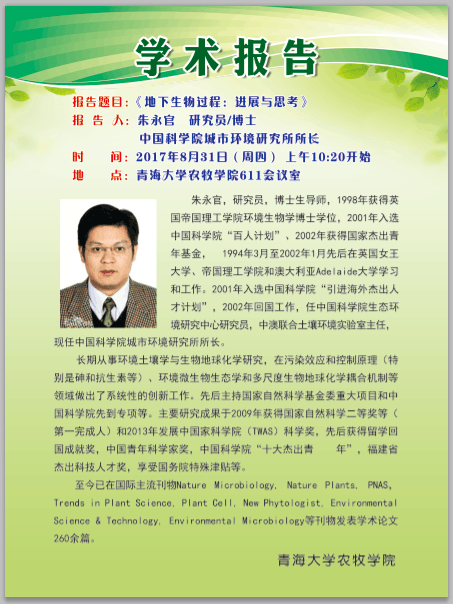 学术报告会:地下生物过程-进展与思考 报告人:中国科天博体育 城市环境研究所所长研究员(博士)朱永官