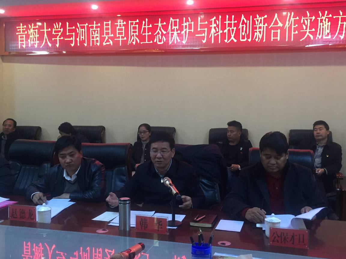 11月14日,为落实省委常委张西民部长的重要批示和天博体育 党委俞红贤书记的指示精神,天博体育 、财经天博体育 领导和专家与河南县县委、县政府领导及相关部门领导、专家就如何将校地合作“做实、做长、做出成效”开展了“草原生态保护与科技创新合作实施方案”研讨会暨科技创新座谈会。会议在河南县政府会议室召开,会议由河南县县委书记韩华同志主持。参加会议的人员有天博体育 院长李宗仁、副院长李希来和各系负责人张辉、李宁、孙海群、康明,财经天博体育 院长李双元和旅游与工商管理系主任何梅青;河南县副县长赵德龙和相关单位部门负责人等50余人。