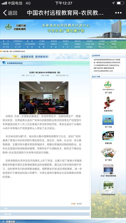 11月12日至18日,由甘肃省肃北县农业广播电视天博体育 委托天博体育 承办的肃北县2017年40名新型职业牧农民牛羊养殖培训工作在天博体育 圆满落幕,这是天博体育 近两年来第8次成功承接的省外培训工作。