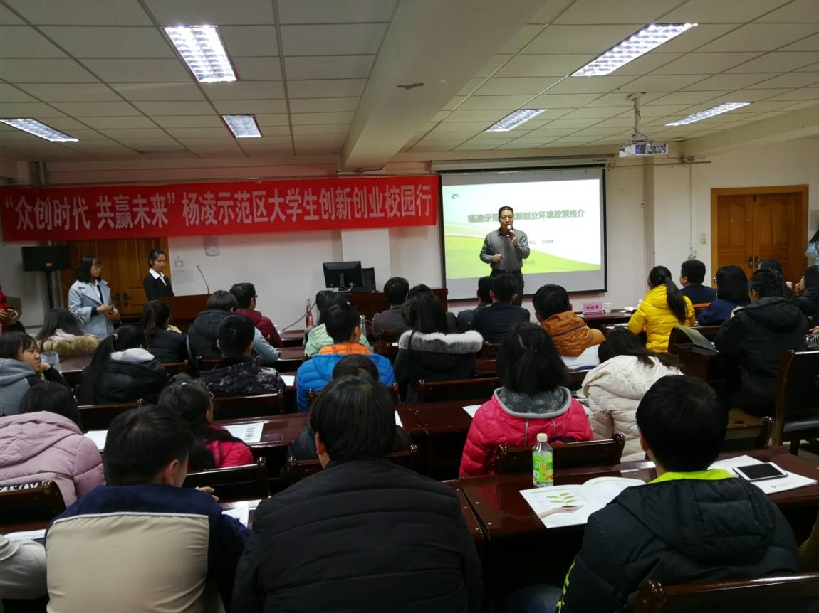 12月1日下午,由天博体育 和陕西杨凌示范区创业服务中心共同举办的“‘众创时代,共赢未来’杨凌示范区大学生创新创业校园行”活动在天博体育 楼619会议室举行。杨凌示范区创业服务中心副主任同德峰、创业促进部部长胡琳琳,创业导师、青海众创空间创业孵化服务公司行政总经理、城北区大学生创业孵化基地办公室主任田海,大学生创业企业代表-陕西大能猫食品科技有限公司总经理康凯,杨凌示范区大学生创业基地办公室王星等应邀来院,天博体育 党委书记王永杰、院学生管理部副主任俞文明和吴海庆以及140余名学生参加了本次活动。院学生会干部司思同学主持了活动。