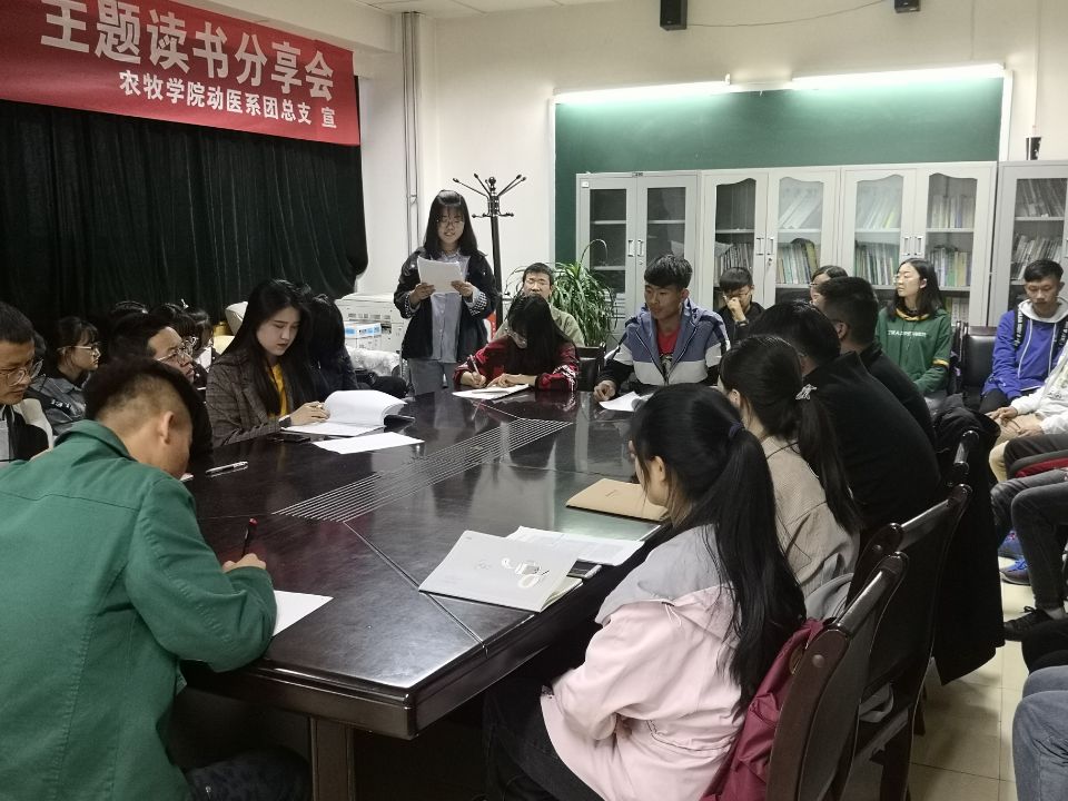 动物医学系承办的院团委发起的纪念五四运动100周年系列活动“新时代·新阅读——致敬五四100年”读书分享日在农牧楼411教室举行。动物医学系团总支副书记马存财同学主持活动。